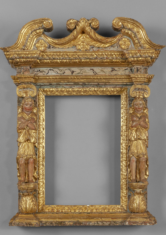 Edicola in legno finemente intagliato dorato e laccato con angeli ai lati Venezia sec.XVII