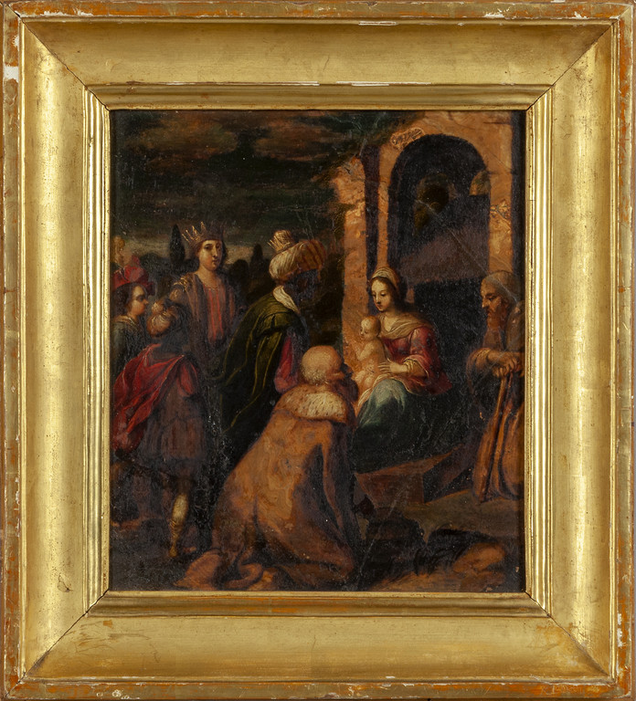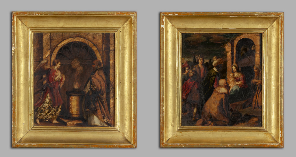 Scuola romana inizi sec.XVII 'Adorazione dei Magi' e 'L'Arcangelo Gabriele annuncia la nascita di un figlio a Zaccaria' coppia di olii su onice cornici in legno dorato e intagliato sec.XIX