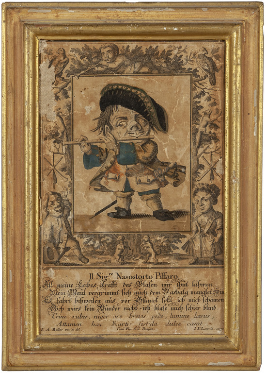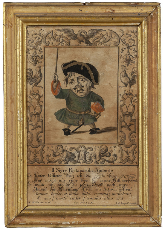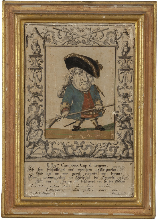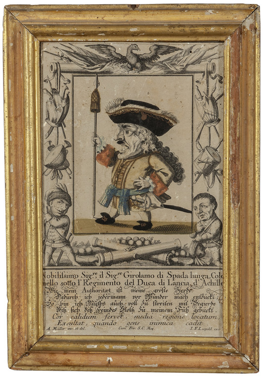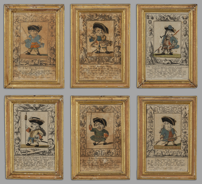 Sei stampe con soggetto umoristico militare sec.XVIII cornici antiche