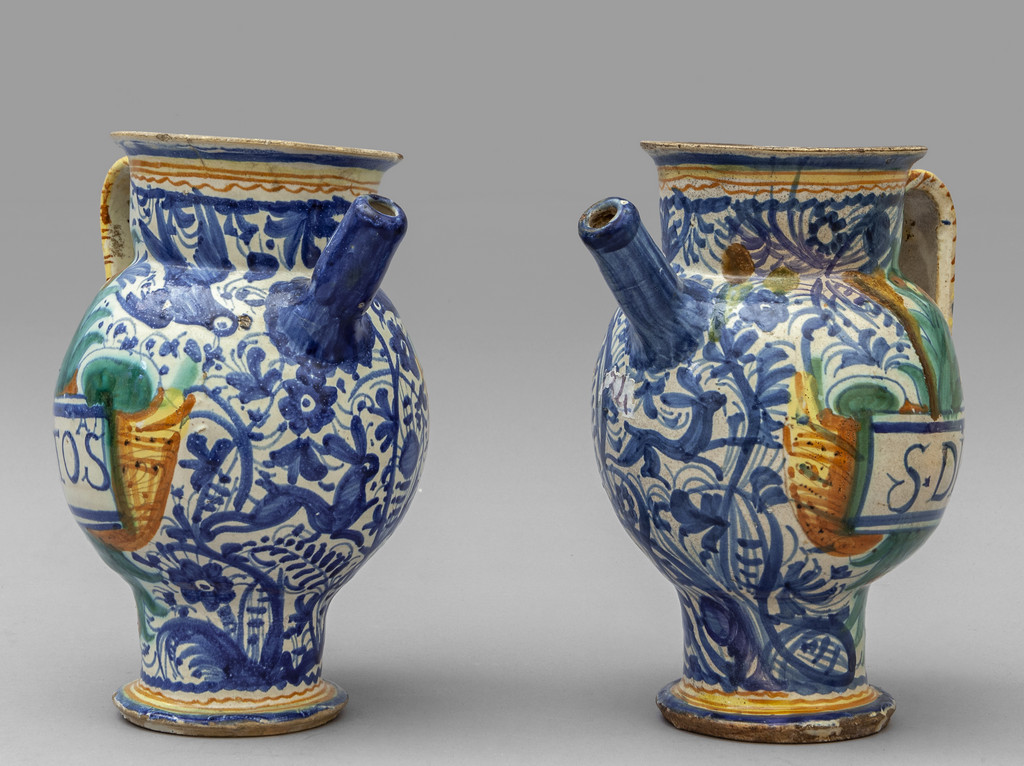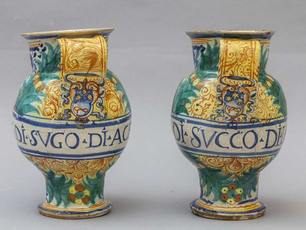 Coppia di versatoi in maiolica policroma con scritta S.DI. Succo di Limone e S.DI. Succo di Acetosa Venezia sec.XVI