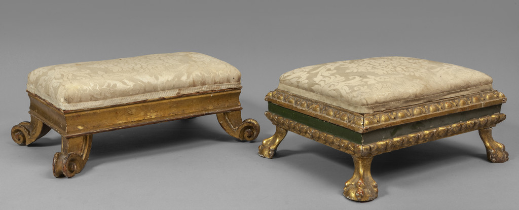 Due poggiapiedi in legno intagliato laccato e dorato sec.XVIII