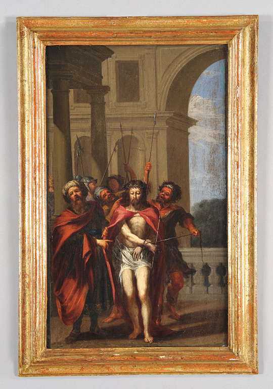Scuola genovese sec.XVII 'Cristo deriso' olio su tavola (cm.30x52)