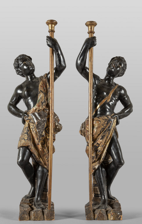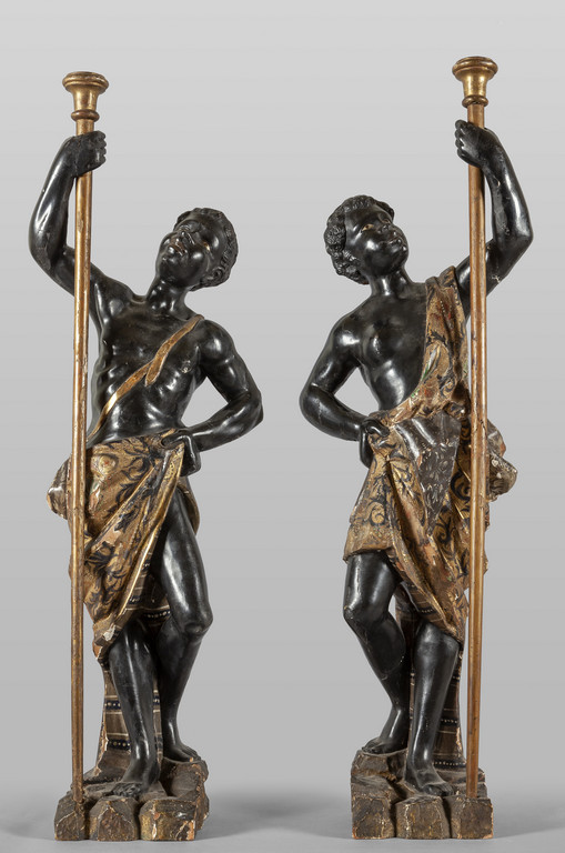 Coppia di moretti in legno finemente intagliato laccato e dorato Venezia fine sec.XVIII