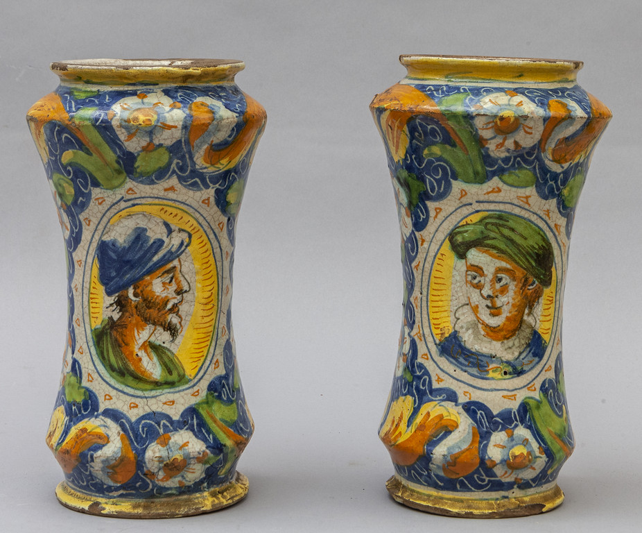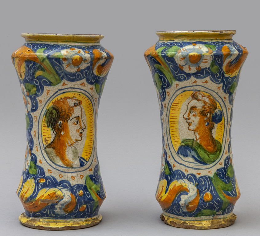 Coppia di albarelli in maiolica policroma con al centro medaglioni con personaggi Venezia sec.XVI