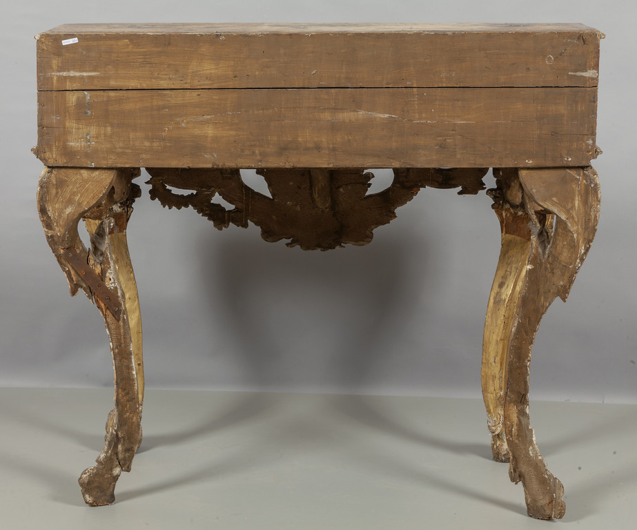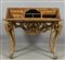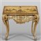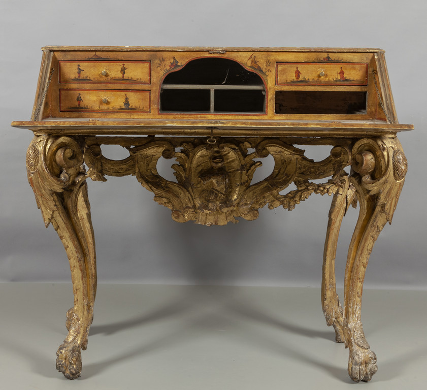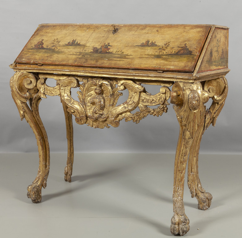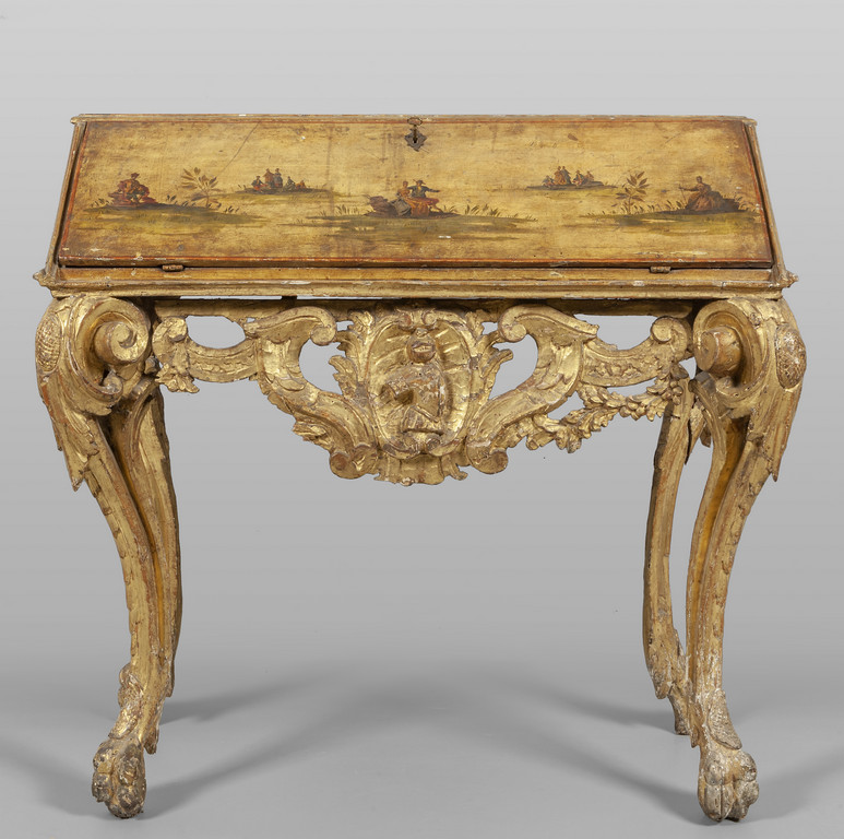 Bureau a gambe alte laccato e decorato ad arte povera con figurine in un paesaggio gambe in legno intagliato e dorato a mecca Roma sec.XVIII
