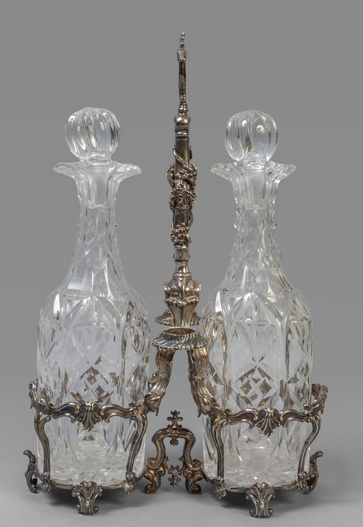 Oliera in argento sbalzato con grandi ampolle in cristallo molato Francia II metà sec.XIX