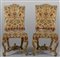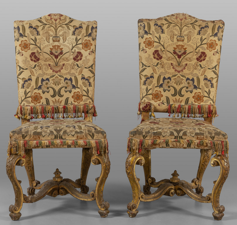 Coppia di sedie Luigi XIV in legno finemente intagliato e dorato gambe unite da traverse Italia Centrale sec.XVIII