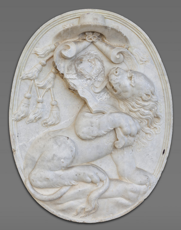 Grande stemma raffigurante leone rampante in marmo statuario Italia sec.XVII