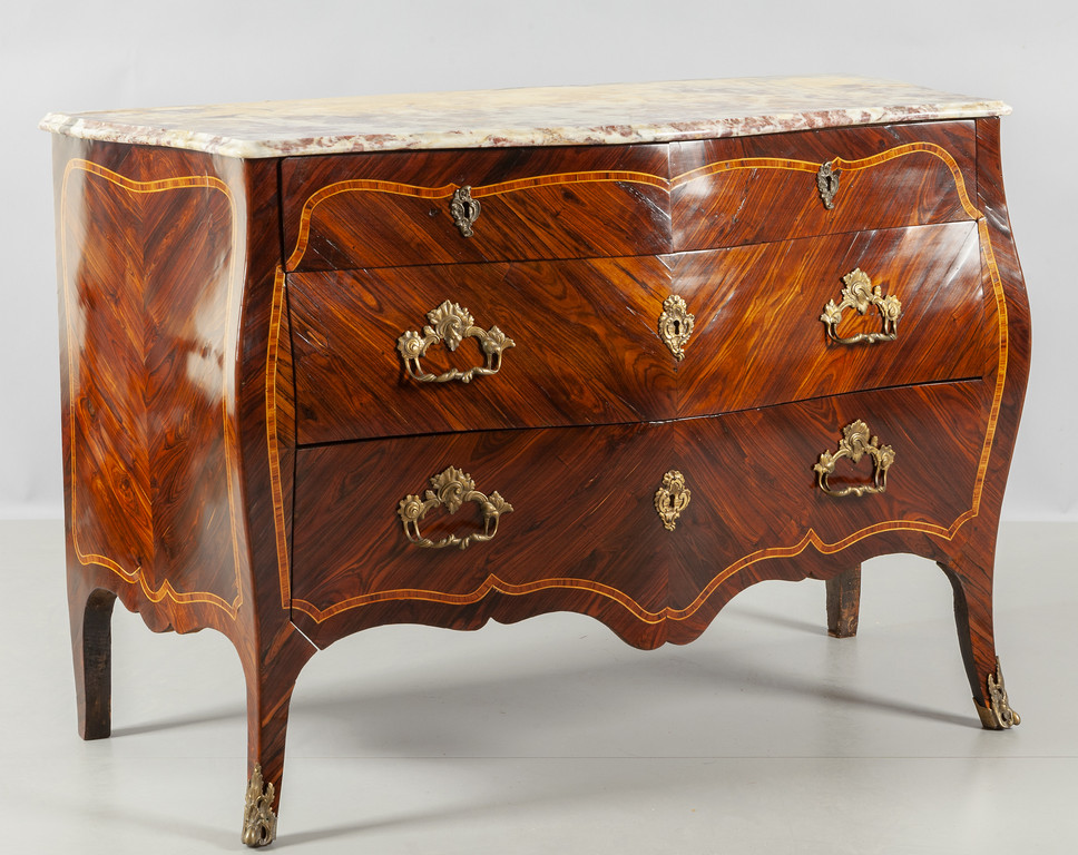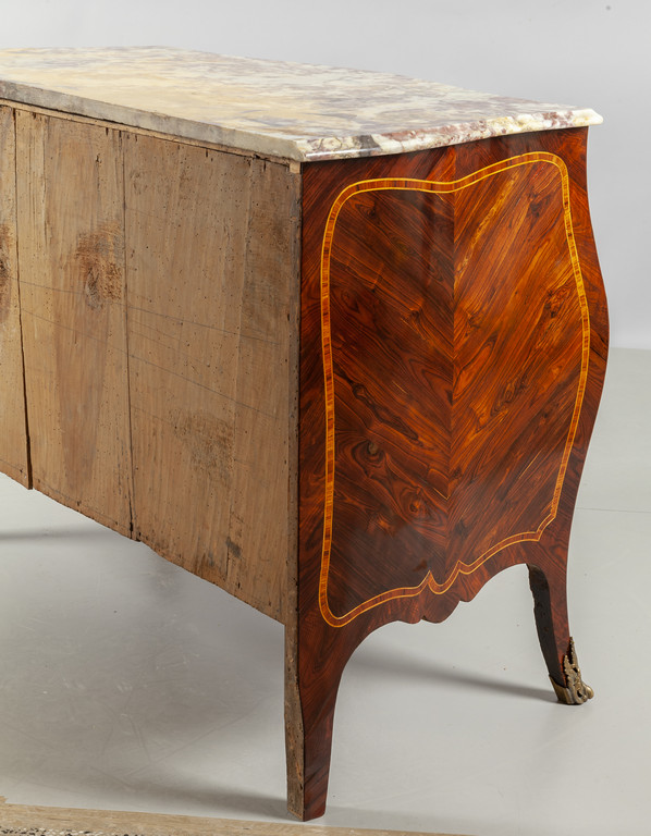 Comò Luigi XV a due cassetti più due lastronato in palissandro e filettato in legni vari piano in marmo Genova sec.XVIII
