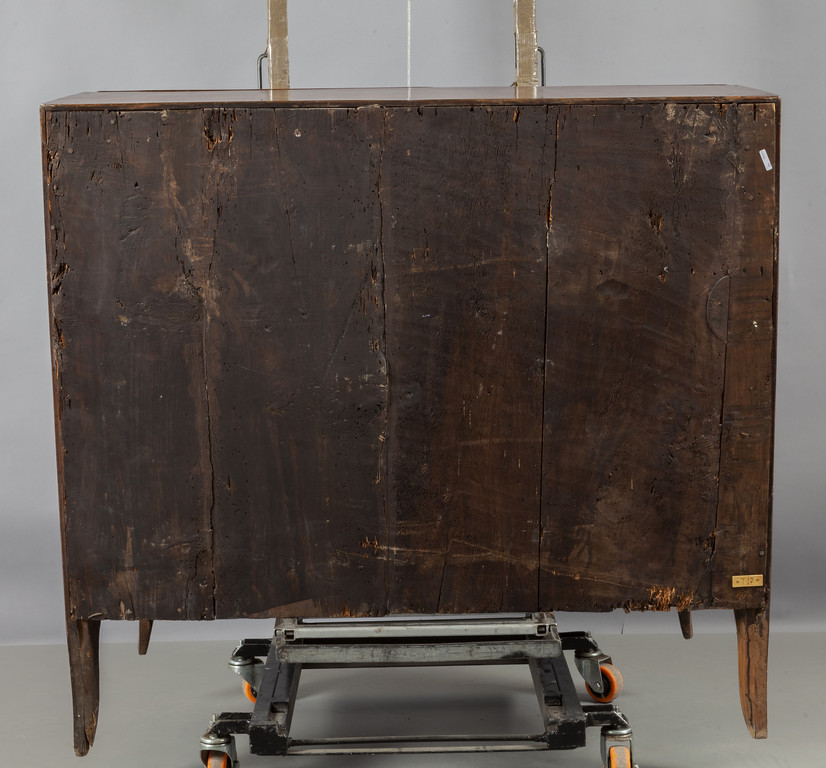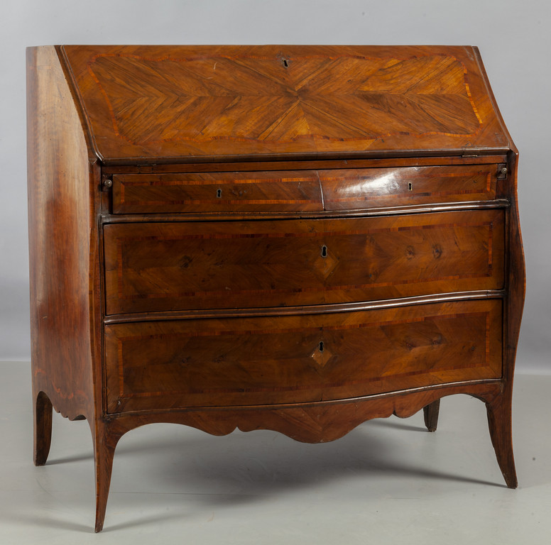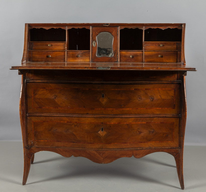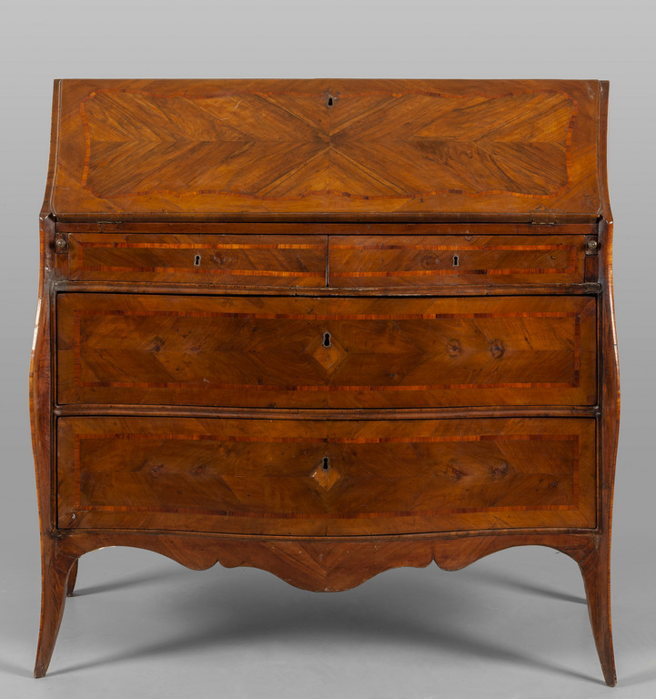 Bureau Luigi XIV lastronato in palissandro e filettato in legno di rosa due cassetti grandi e due piccoli movimentato sul fronte e sui fianchi con alette incorporate Genova I metà sec.XVIII