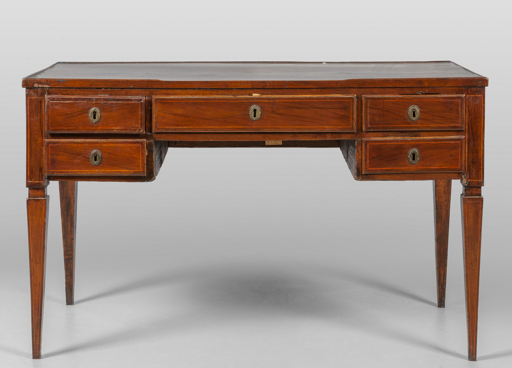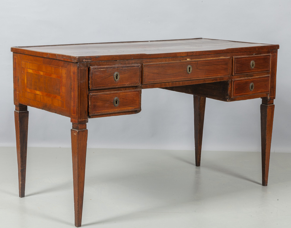 Scrittoio Luigi XVI da centro lastronato in palissandro e filettato in bois de rose medaglione centrale sul piano due più due cassetti laterali ed uno centrale Veneto fine sec.XVIII