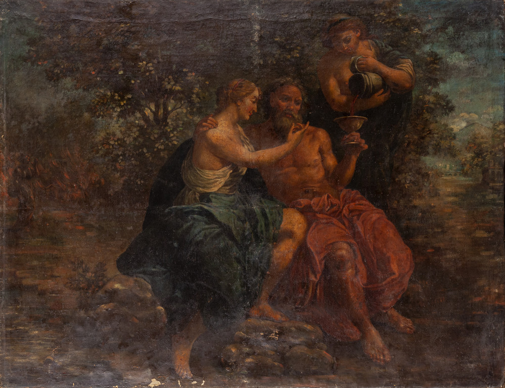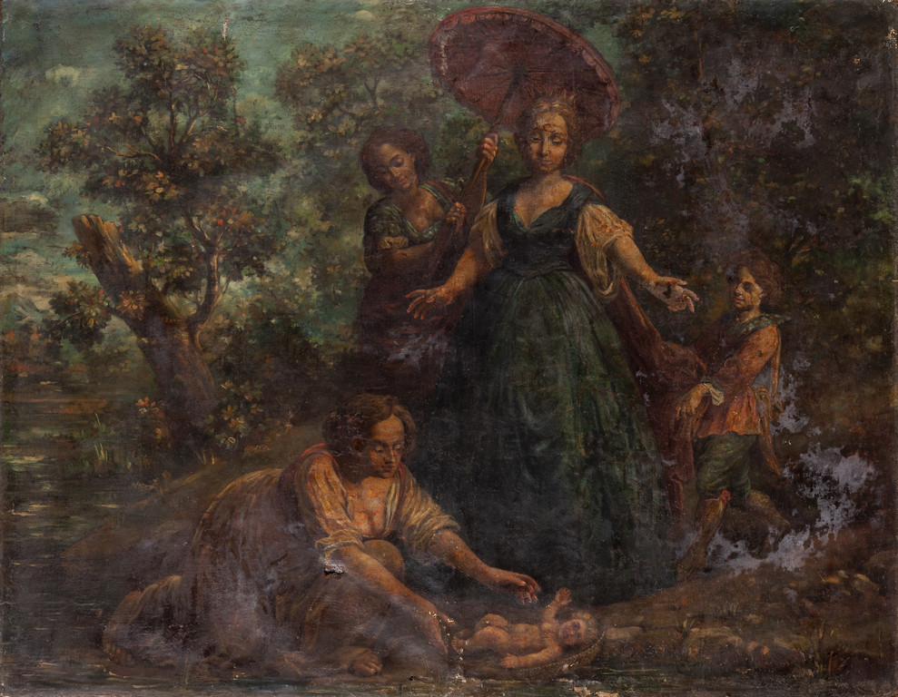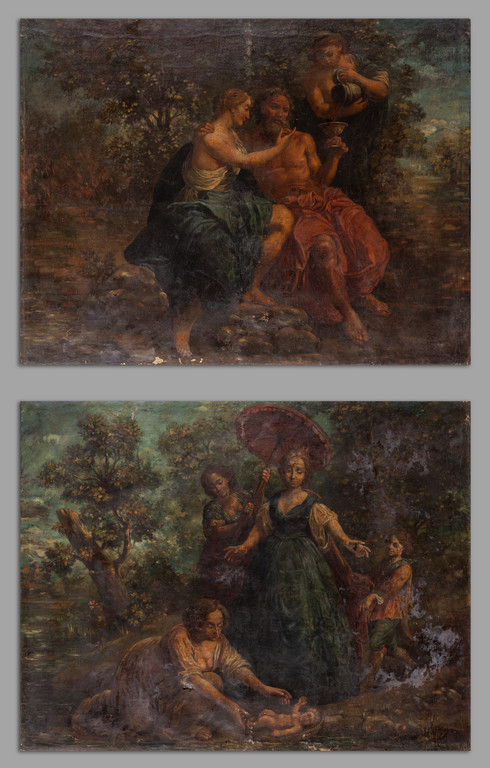 Scuola italiana sec.XVIII 'L'ebrezza di Noè' e 'Mosè salvato dalle acque' coppia di olii mancanze e ridipinture