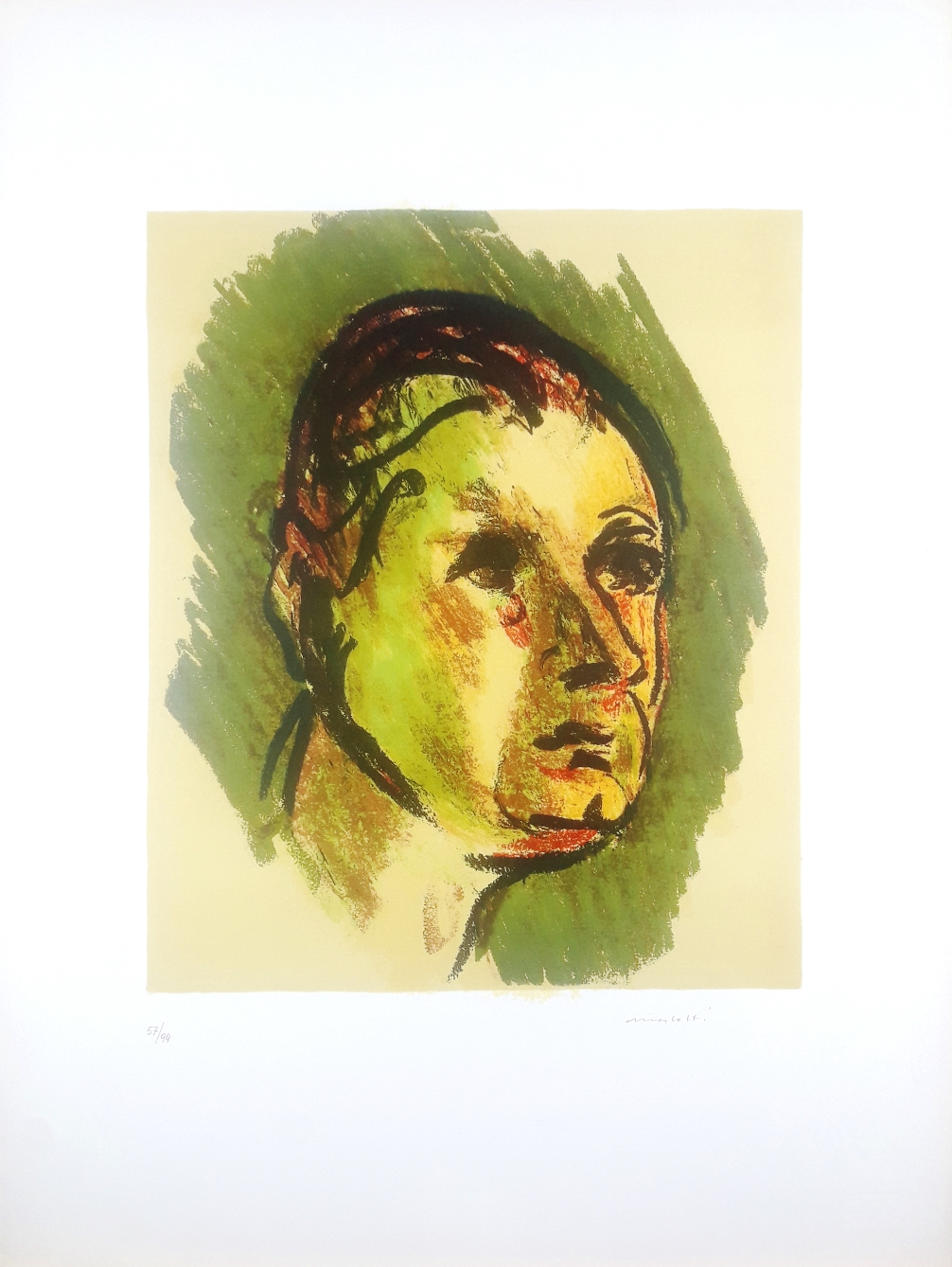 MORLOTTI ENNIO Roma 1891-Venezia 1984 “Autoritratto” litografia su cartoncino cm 48x63 del 1977. Timbro a secco e firma a matita sul fronte in basso a destra, tiratura 57/99 a sinistra.
