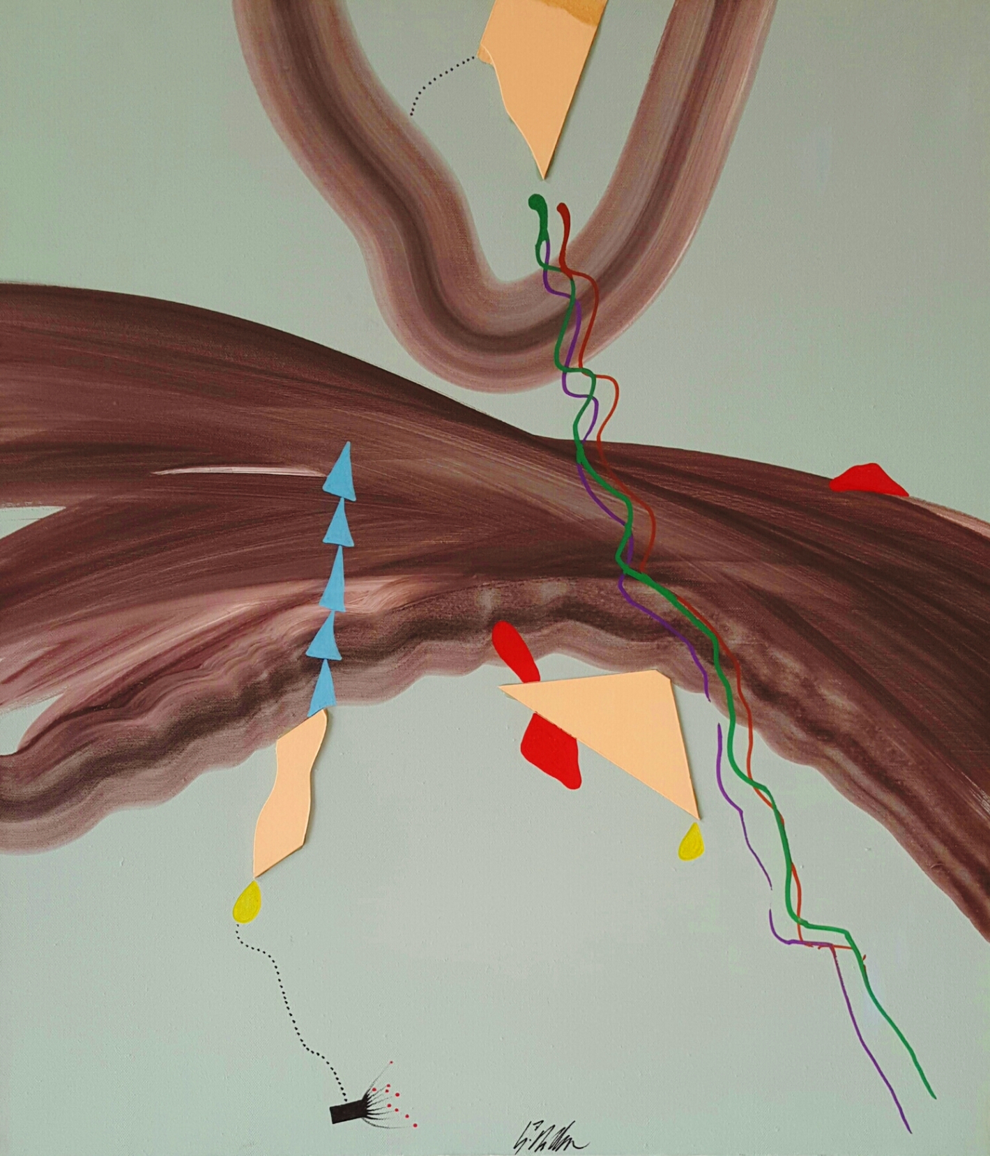 DANGELO SERGIO Milano 1932 “Tracer comme laborer” olio, collage e tecnica mista su tela cm 70x80. Firmato sul fronte in basso al centro, al retro titolo e dedica. Autentica a cura dell’artista.