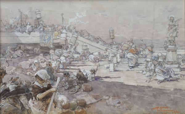 Riccardo Pellegrini (Milano, 1863 - Crescenziago, 1934) AL PASSAGGIO DELLA PROCESSIONE, 1900 Acquerello su carta, cm. 20x30 Firma e data in basso a destra.