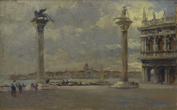 Emanuele Brugnoli (Bologna, 1859 - Venezia, 1944) VENEZIA Olio su cartone, cm. 20x31,5 Firma in basso a destra. Timbro della Bottega d’Arte Montecatini Terme.