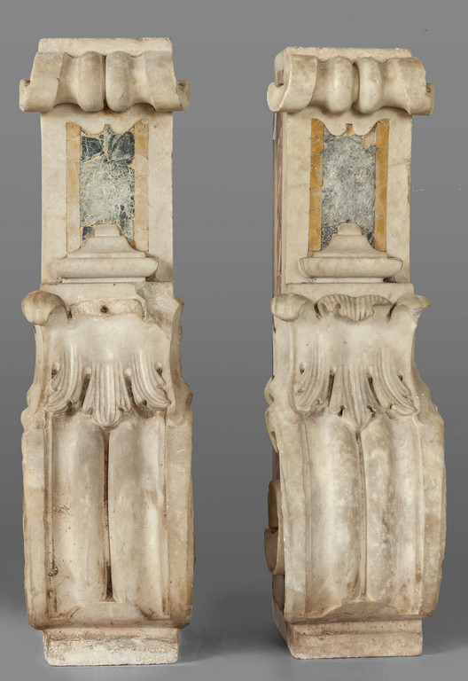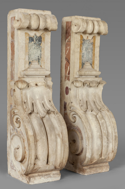 Coppia di mensole Luigi XIV in marmo bianco con intarsi in marmi policromi sec.XVII