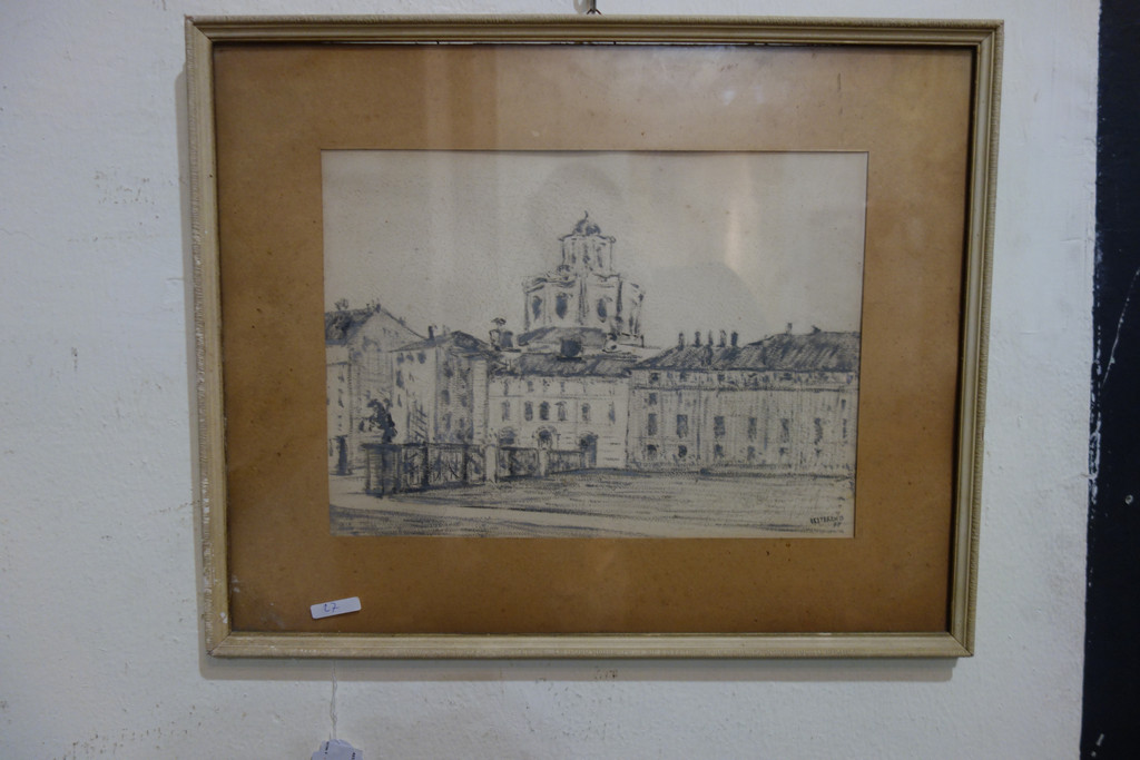 De Stefanis 'La piazzetta Reale e la Chiesa di San Lorenzo a Torino' carboncino su carta f.to in b. a ds. e d.to nel retro 1955