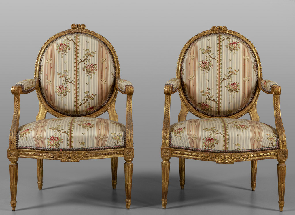 Coppia di poltrone Luigi XVI in legno intagliato e dorato Francia II metà sec.XVIII (una stampigliata G.Jacob)
