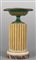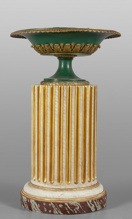 Grande vaso in metallo decorato in verde e oro poggiante su una colonna in legno intagliato dorato e laccato sec.XIX