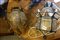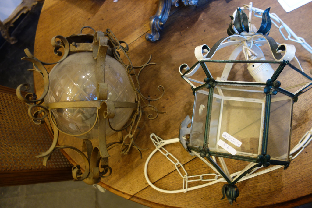 Lampadario in metallo con boccia centrale in vetro e piccola lanterna laccata bianco e verde