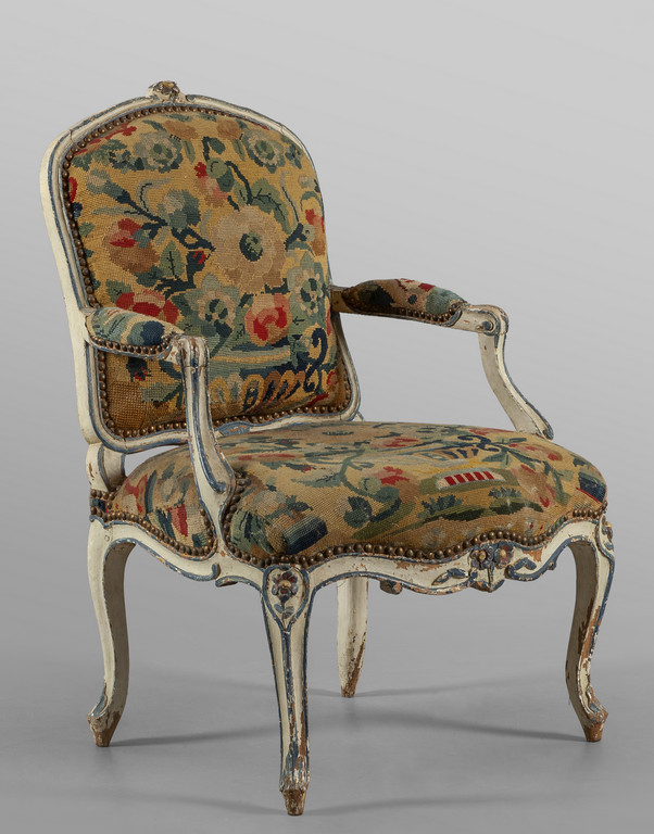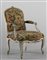 Poltrona Luigi XV in legno laccato bianco e azzurro rivestita in tessuto ricamamto Francia sec.XVIII