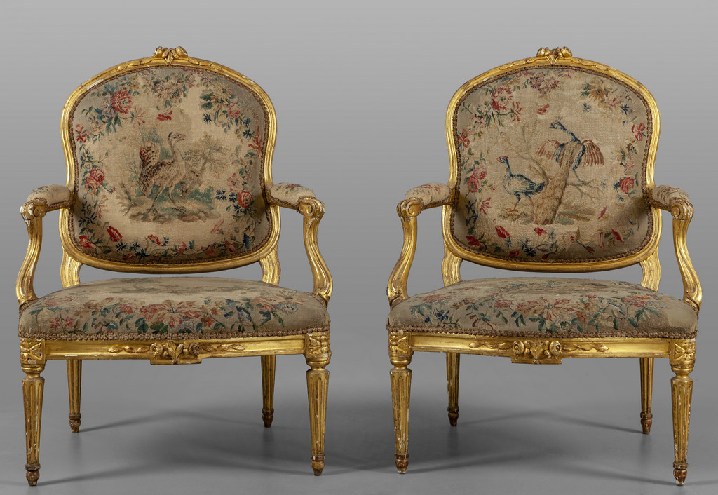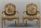 Coppia di poltrone Luigi XVI in legno intagliato e dorato copertura a piccolo punto Francia sec.XVIII (cattivo stato)