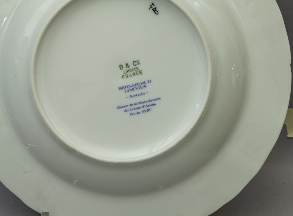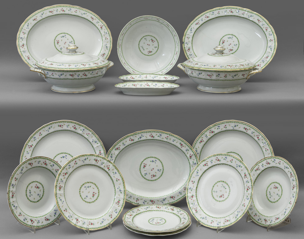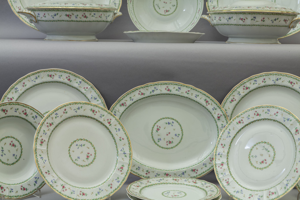 Servizio di piatti in porcellana di Limoges 'Artois' decorata con foglioline e fiori composto da 140 piatti piani 22 fondi 72 frutta 2 zuppiere 2 coppie di piatti da portata ovali 2 riviere un insalatiera due piatti da portata ovali