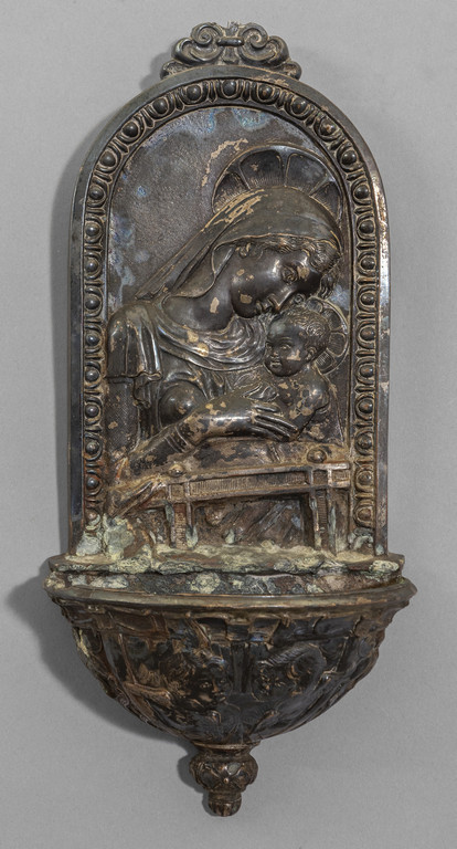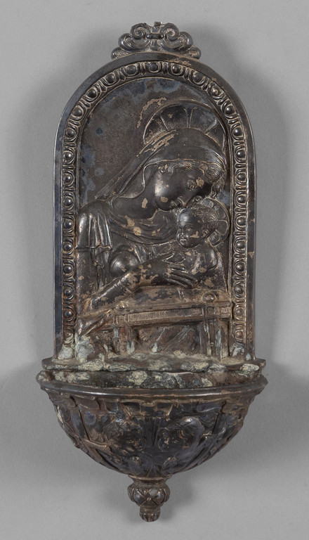 Acquasantiera in metallo argentato raffigurante la Madonna con il Bambino sec.XIX