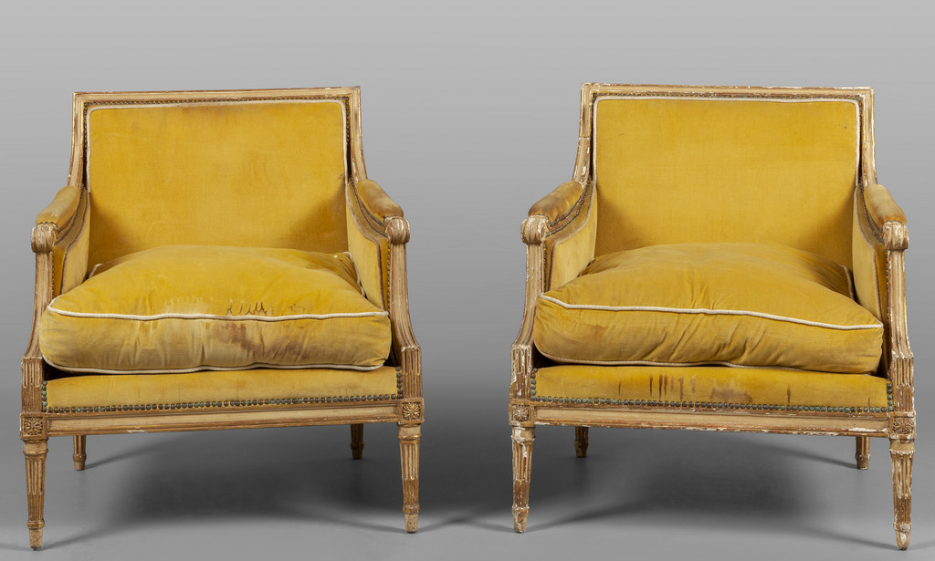 Coppia di bergeres in stile Luigi XVI in legno laccato e dorato ricoperte in velluto giallo stampigliate JME P.Bernard Francia sec.XIX