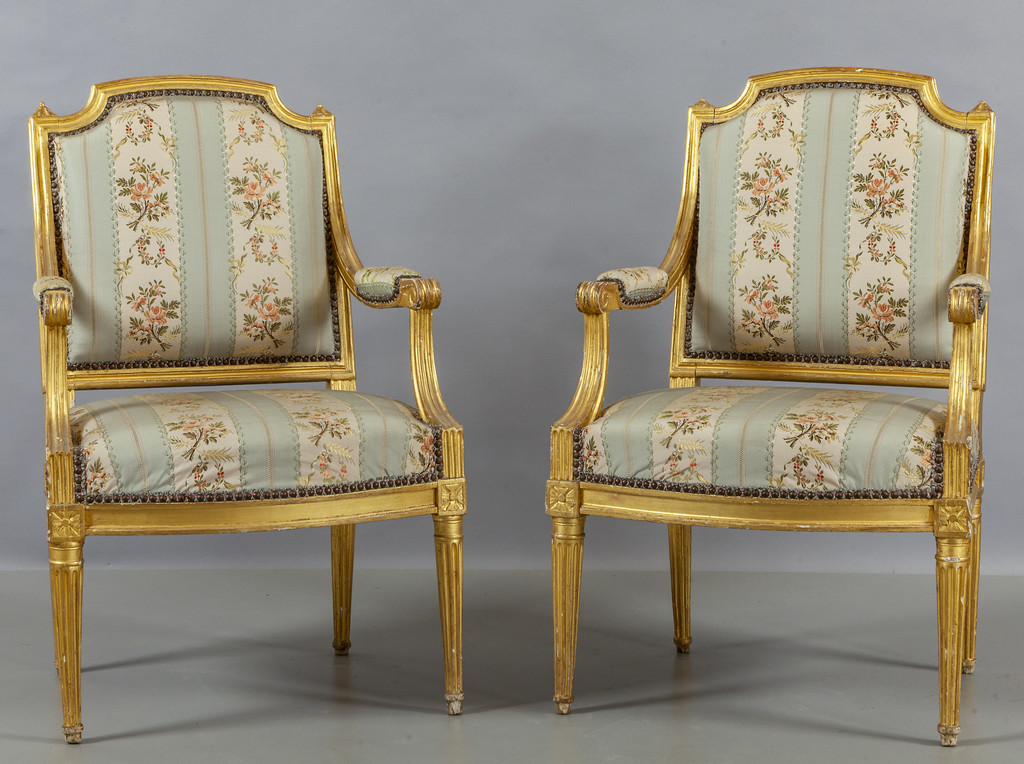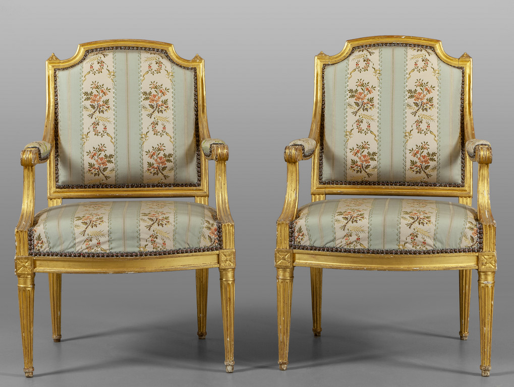 Coppia di poltrone Luigi XVI in legno intagliato e dorato Francia sec.XVIII (doratura posteriore)