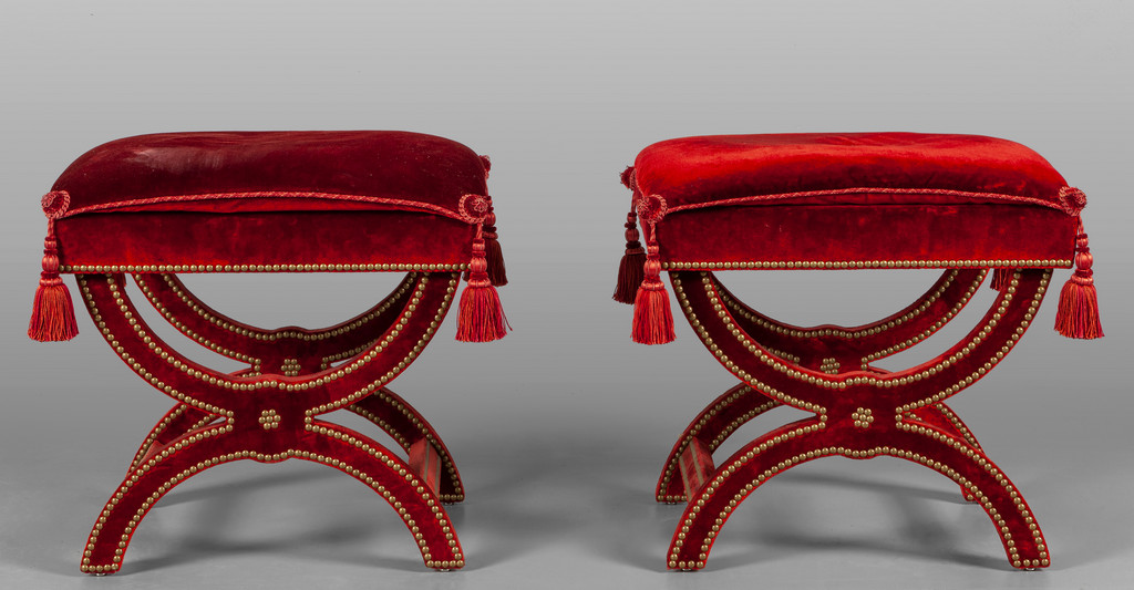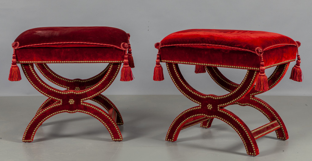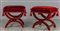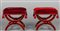 Coppia di sgabelli a tenaglia rivestiti in velluto rosso sec.XX