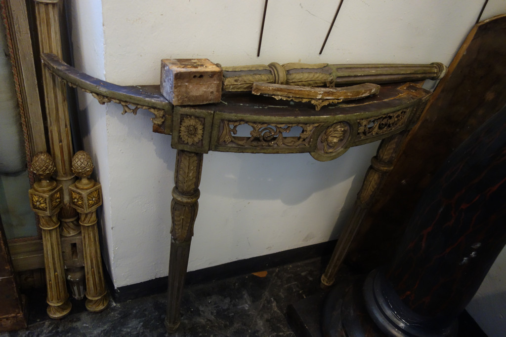 Console Luigi XVI a mezza luna a quattro gambe fascia traforata laccata bianca e verde piano in marmo bardiglio non pertinente Piemonte fine sec.XVIII (pessimo stato)