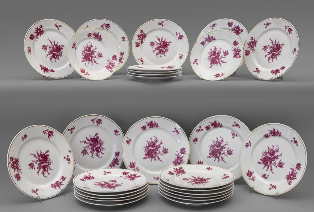 20 Piatti piani e 6 da frutta in porcellana di Limoges decorati a fiori rossi su fondo bianco