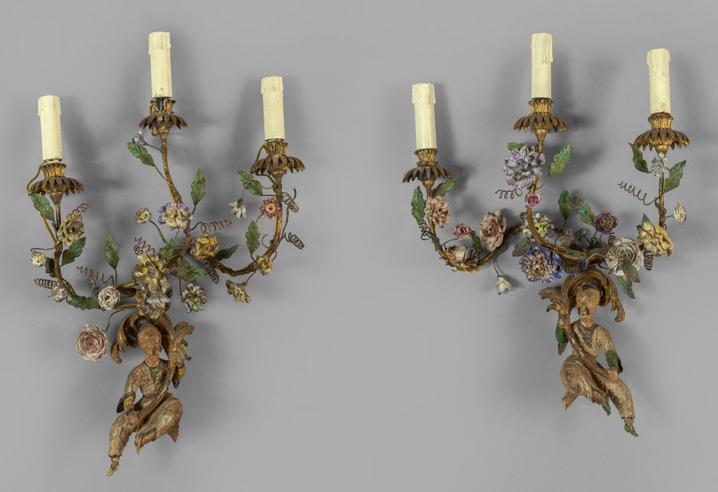 Coppia di apliques a tre luci in ferro dorato con fiori in porcellana sorrette da due cinesini in legno laccato fine sec.XIX