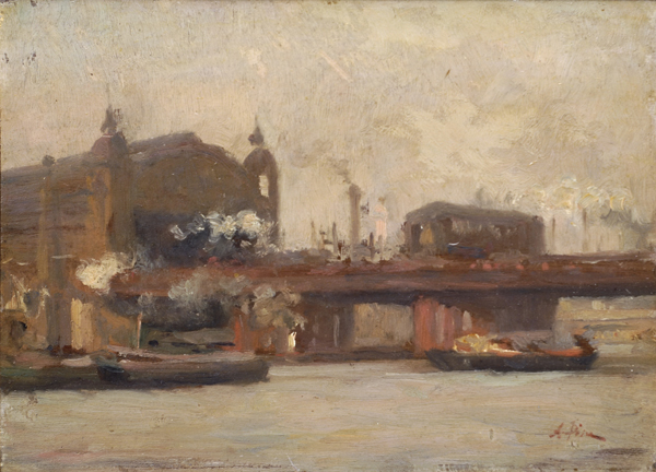 Alberto Pisa (Ferrara, 1864 - Firenze, 1903) TAMIGI Olio su tavola, cm. 20,5x27,5 Sul verso: timbro Galleria d’Arte Duomo, Firenze; timbro Arte Galleria Manetti, Piacenza.