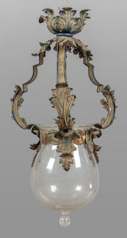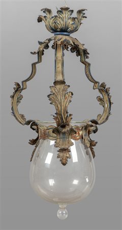Lanterna in stile Luigi XV in metallo laccato bianco e azzurro con boccia centrale in vetro Piemonte (difetti)