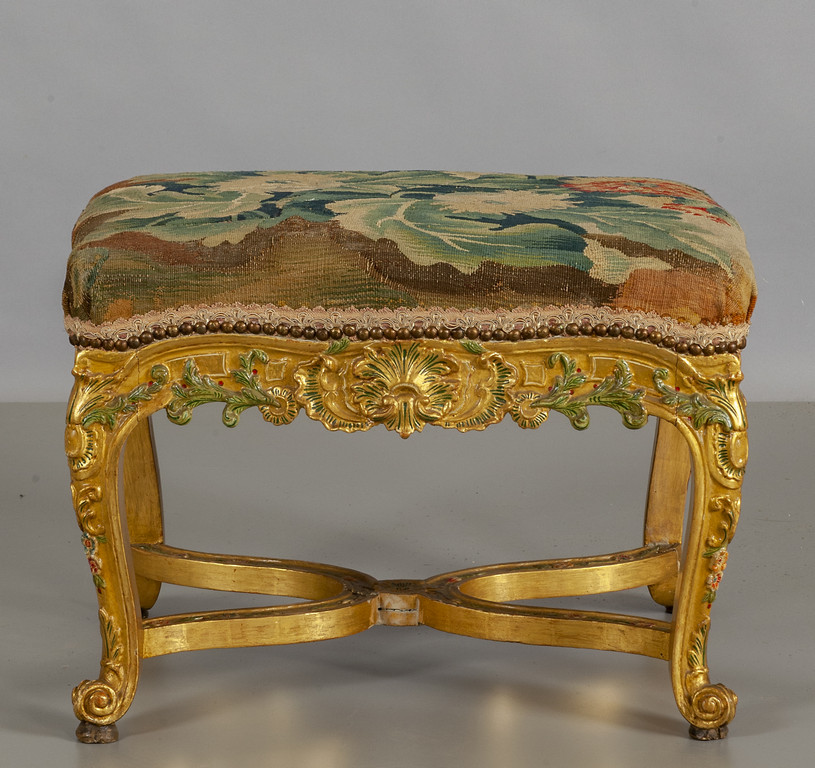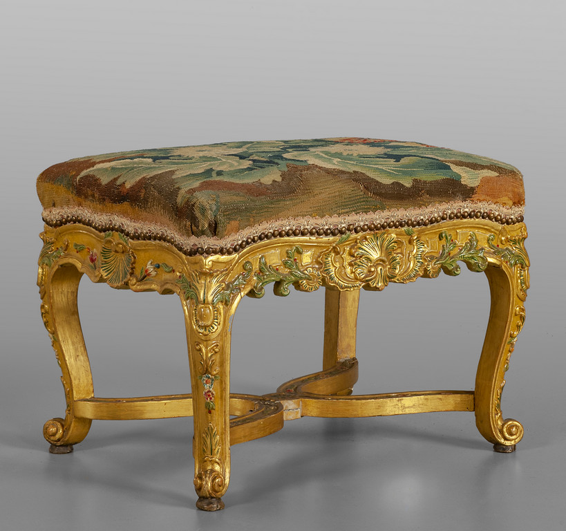 Sgabello in stile Luigi XV in legno intagliato laccato e dorato imbottitura a piccolo punto