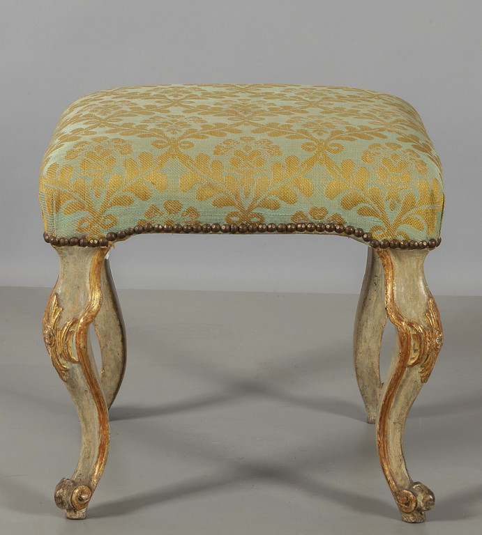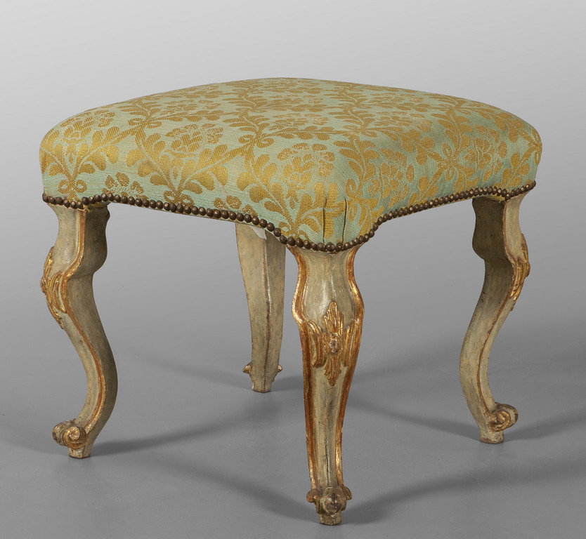 Sgabello barocco in legno laccato a fondo azzurro con intagli dorati Piemonte sec.XVIII