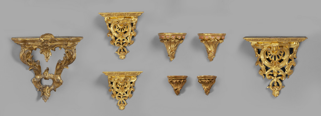 Otto mensoline in legno intagliato di varie epoche forme e misure