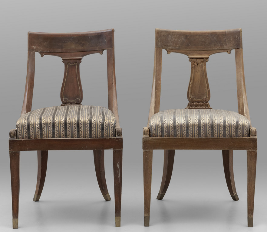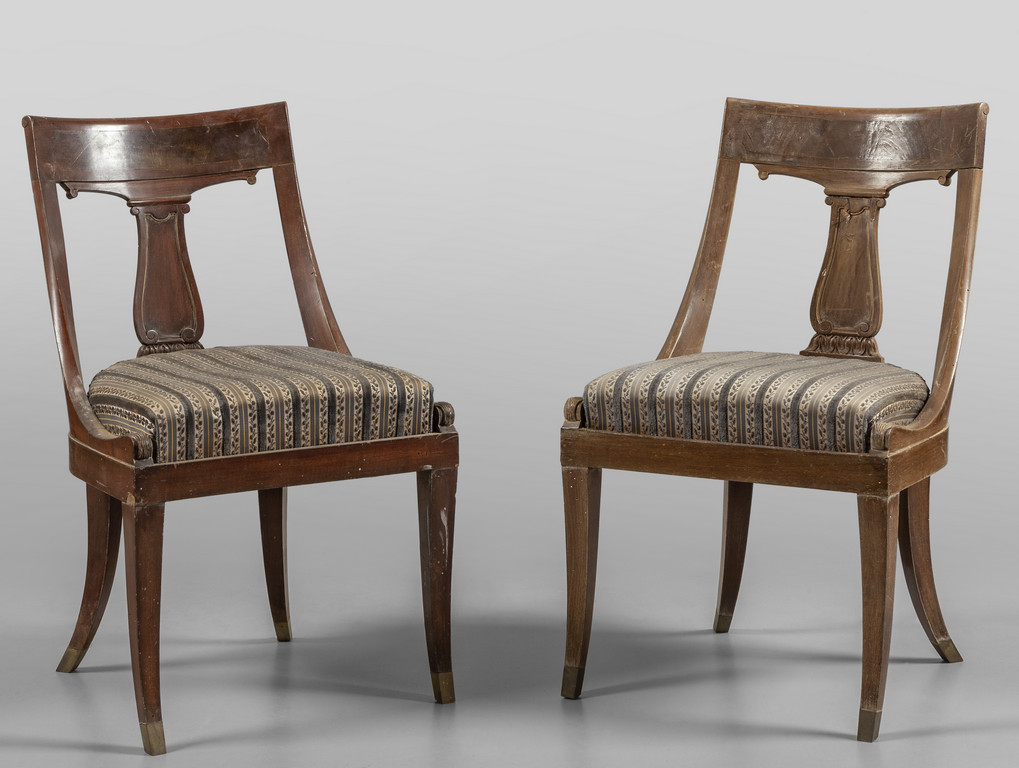 Coppia di sedie con gambe a sciabola piedini rivestiti in ottone schienale a lira Francia sec.XIX