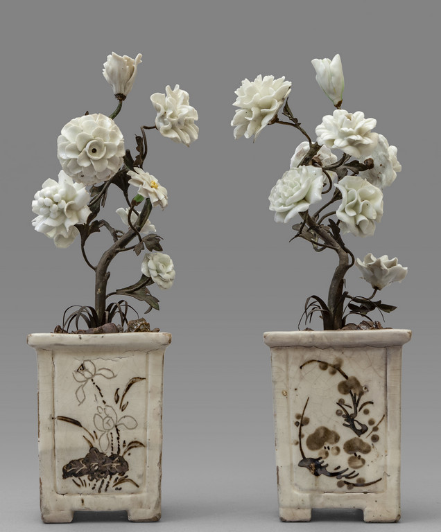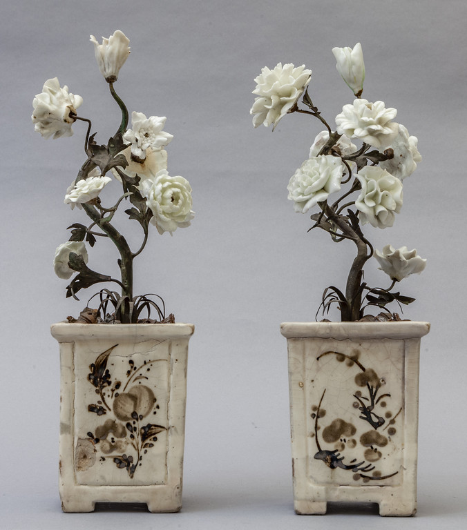 Coppia di vasi in porcellana con piantine in ferro battuto con fiori in porcellana Giappone sec.XIX