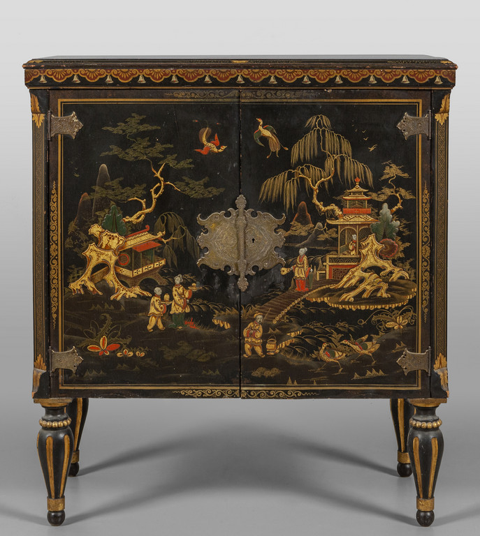 Credenza in legno laccato a fondo nero con decorazione in policromia di gusto orientale sec.XX