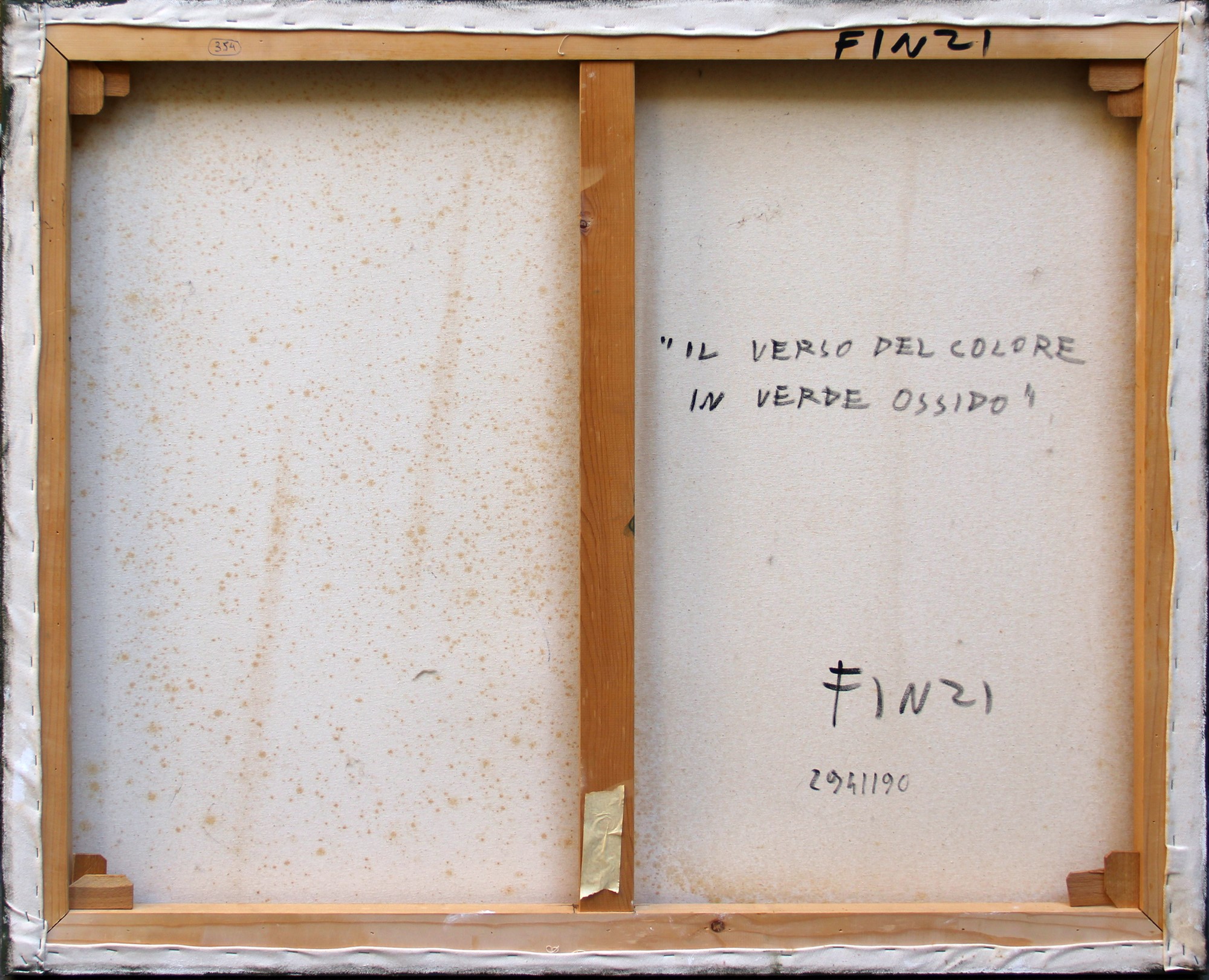 Firma, titolo, firma, numerazione "Finzi, Il verso del colore in verde ossido, Finzi, 2941190" (al retro)