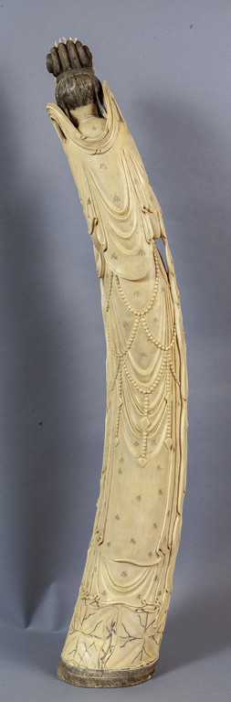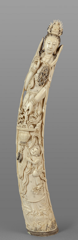 Grande zanna scolpita a motivi di guanin con cesto di fiori Cina inizi sec.XX