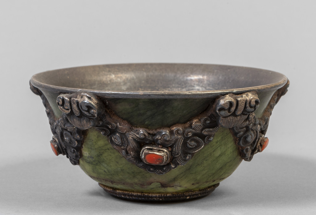 Ciotola in giada montata in metallo argentato con applicazioni in corallo Cina sec.XIX