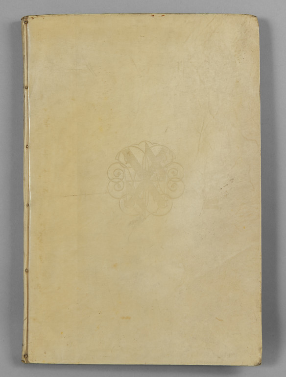 Piena pergamena rigida ottocentesca con monogramma al piatto posteriore (proprietà di William String Maxwell).