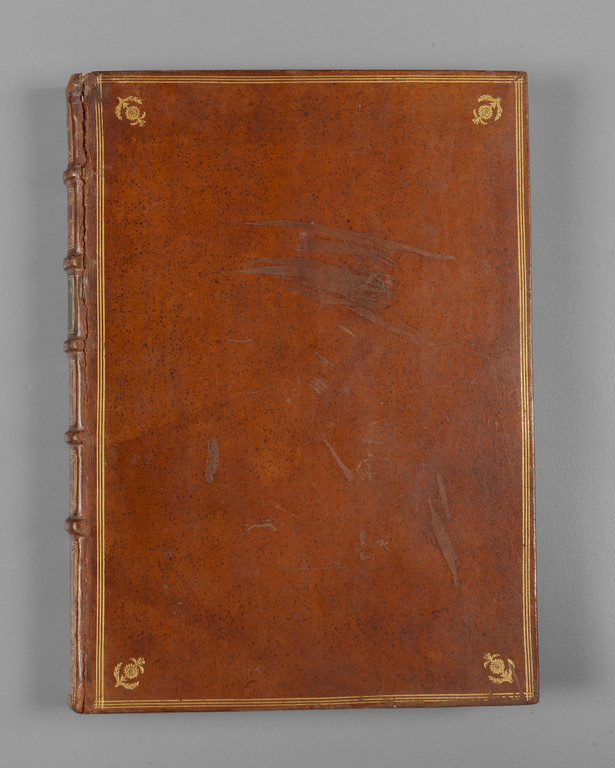 Legatura in piena bazzana d¿epoca, dorso liscio a doppio tassello e motivi floreali e geometrici.
