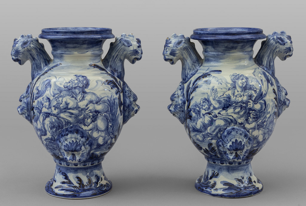 Coppia di idrie in ceramica vecchia Savona decorazione bianca e blu s.te nel fondo MGA