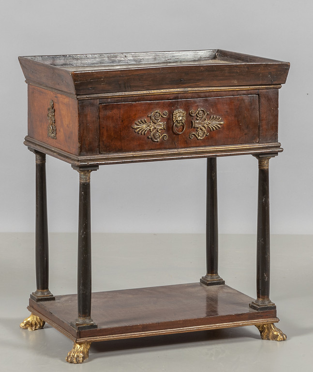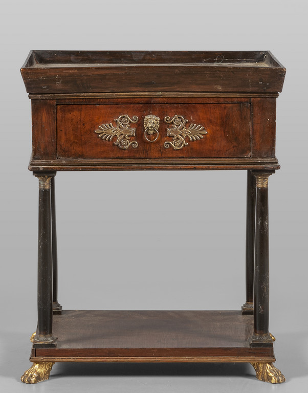 Piccolo tavolino a vassoio lastronato in mogano quattro colonnine in legno ebanizzato sorreggono una fascia con cassetto piedini in legno dorato Venezia inizi sec.XIX